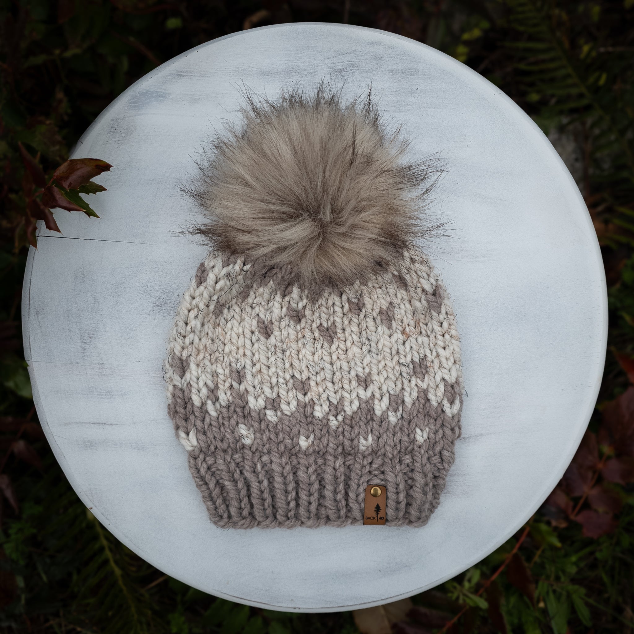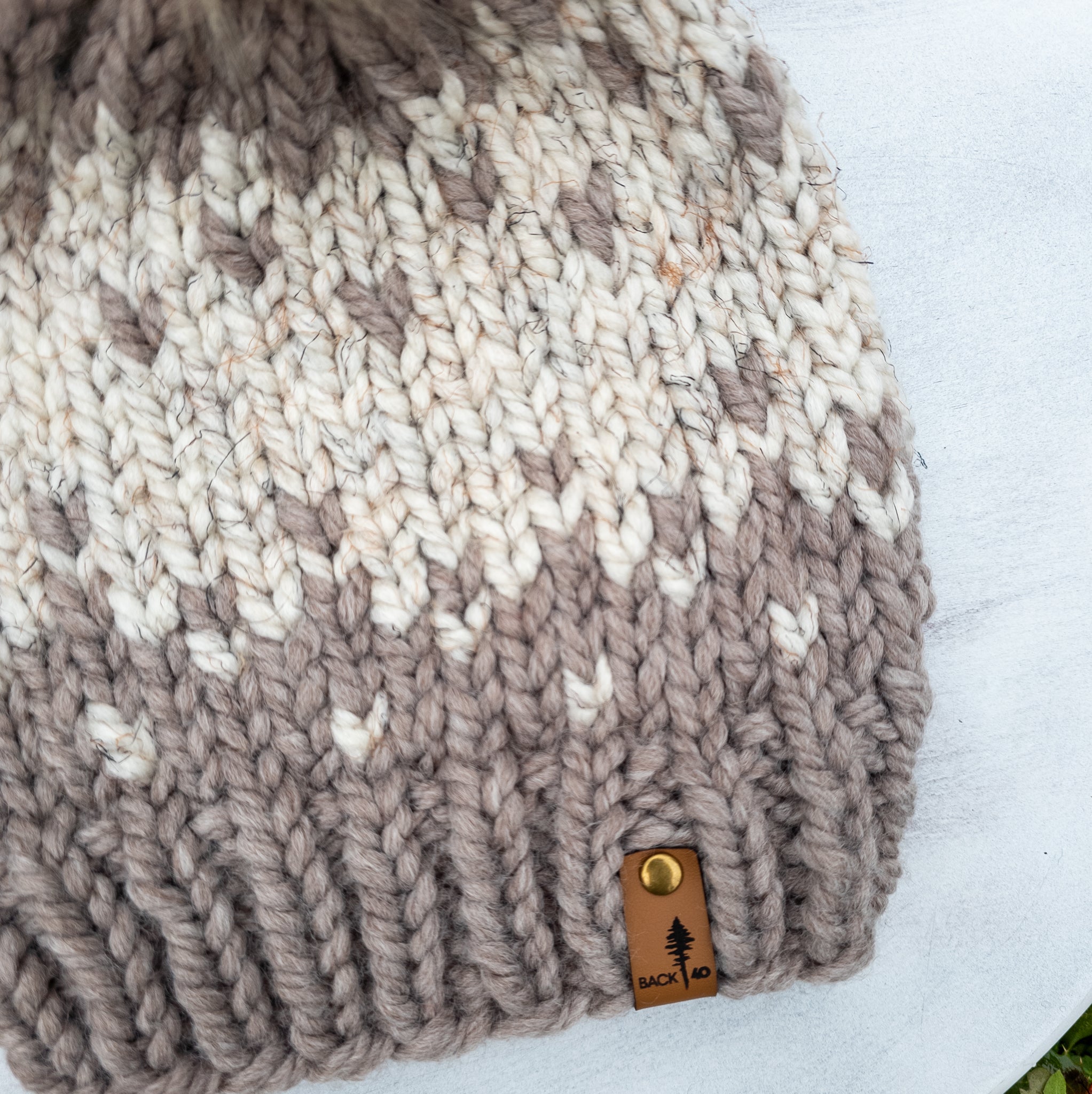 Winterfell Beanie in Driftwood and Wheat with removable Champagne faux fur pom pom.