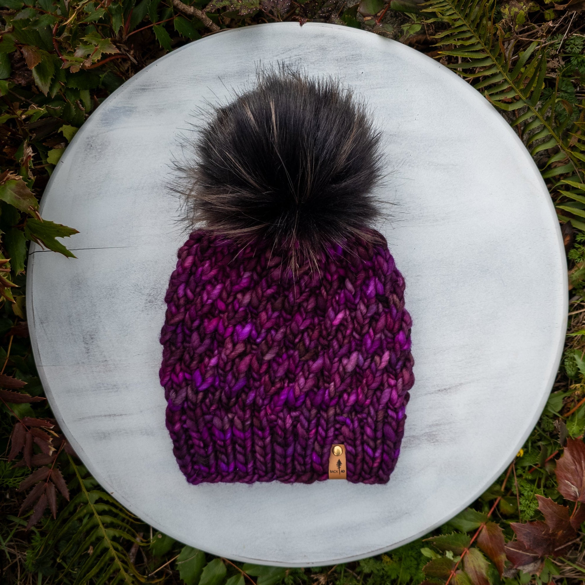 Emilia Beanie in Sabiduria with removable Obsidian faux fur pom pom. Want a different pom on this toque? Leave a note at checkout.