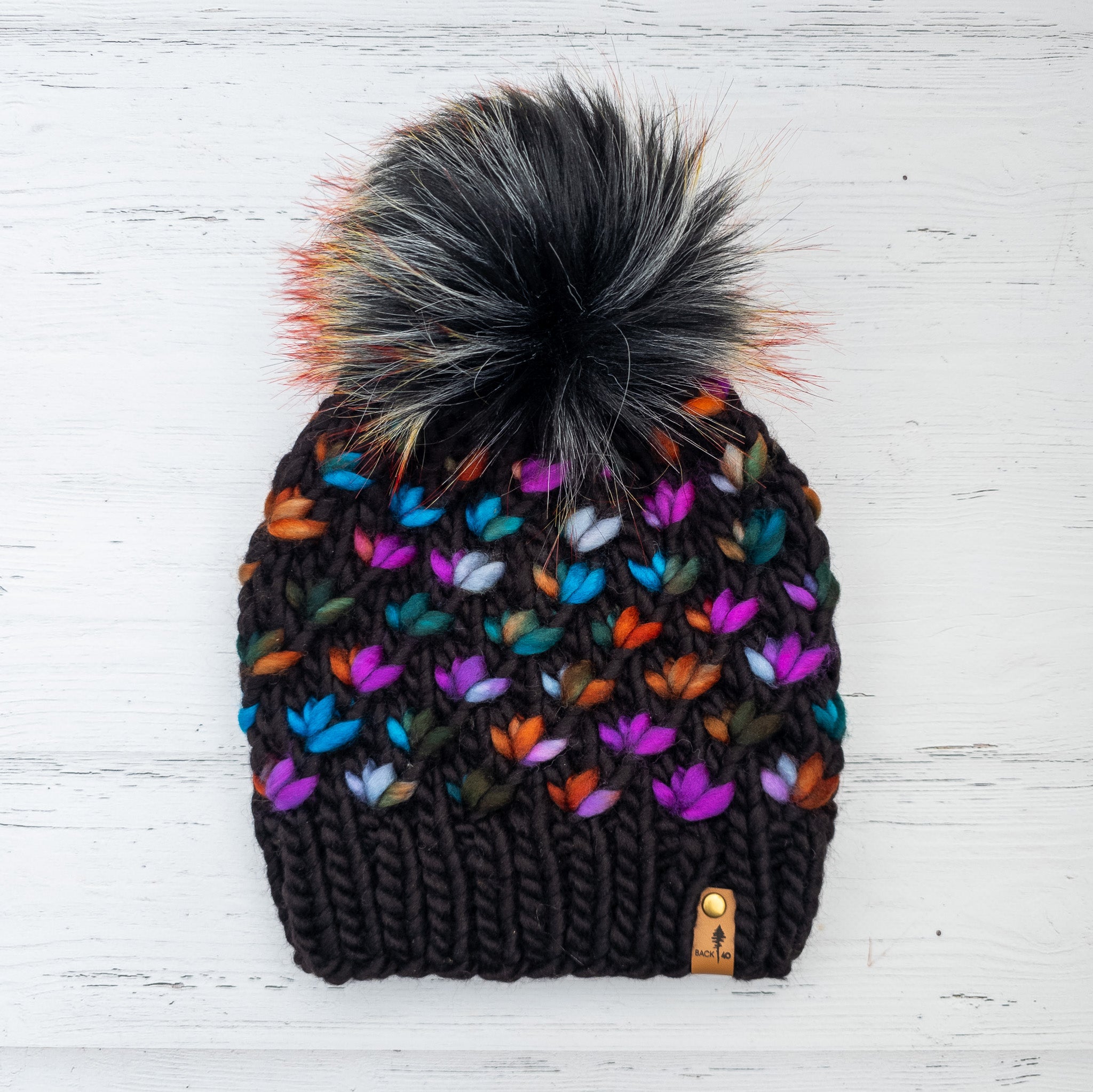 Lotus Flower Beanie in Black and Dragonfly with removable Wildfire faux fur pom pom. Want a different pom on this toque? Leave a note at checkout.
