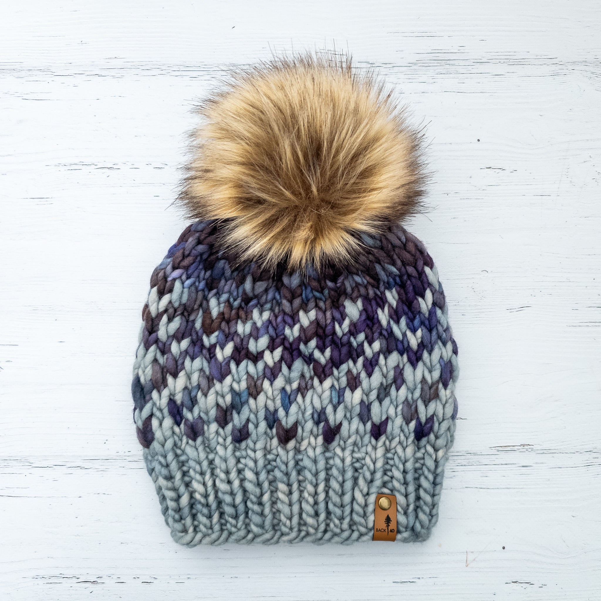 Sunrise Beanie in Cape Cod Grey/Soriano/Pearl Ten with removable Coyote faux fur pom pom. Want a different pom on this toque? Leave a note at checkout.