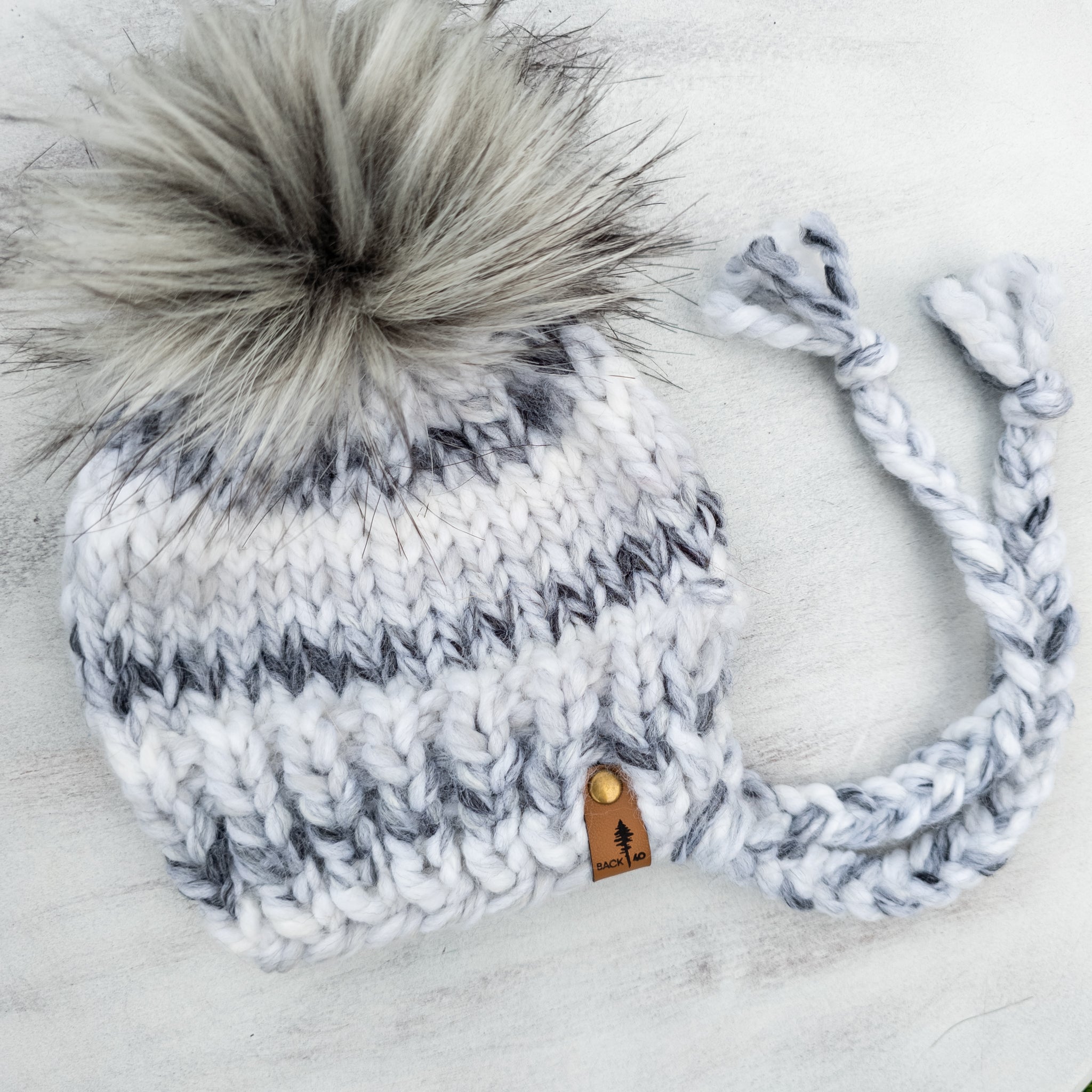 Classic Bonnet split brim beanie with braided ties in Marble with removable Direwolf faux fur pom pom. Want a different pom on this toque? Leave a note at checkout.