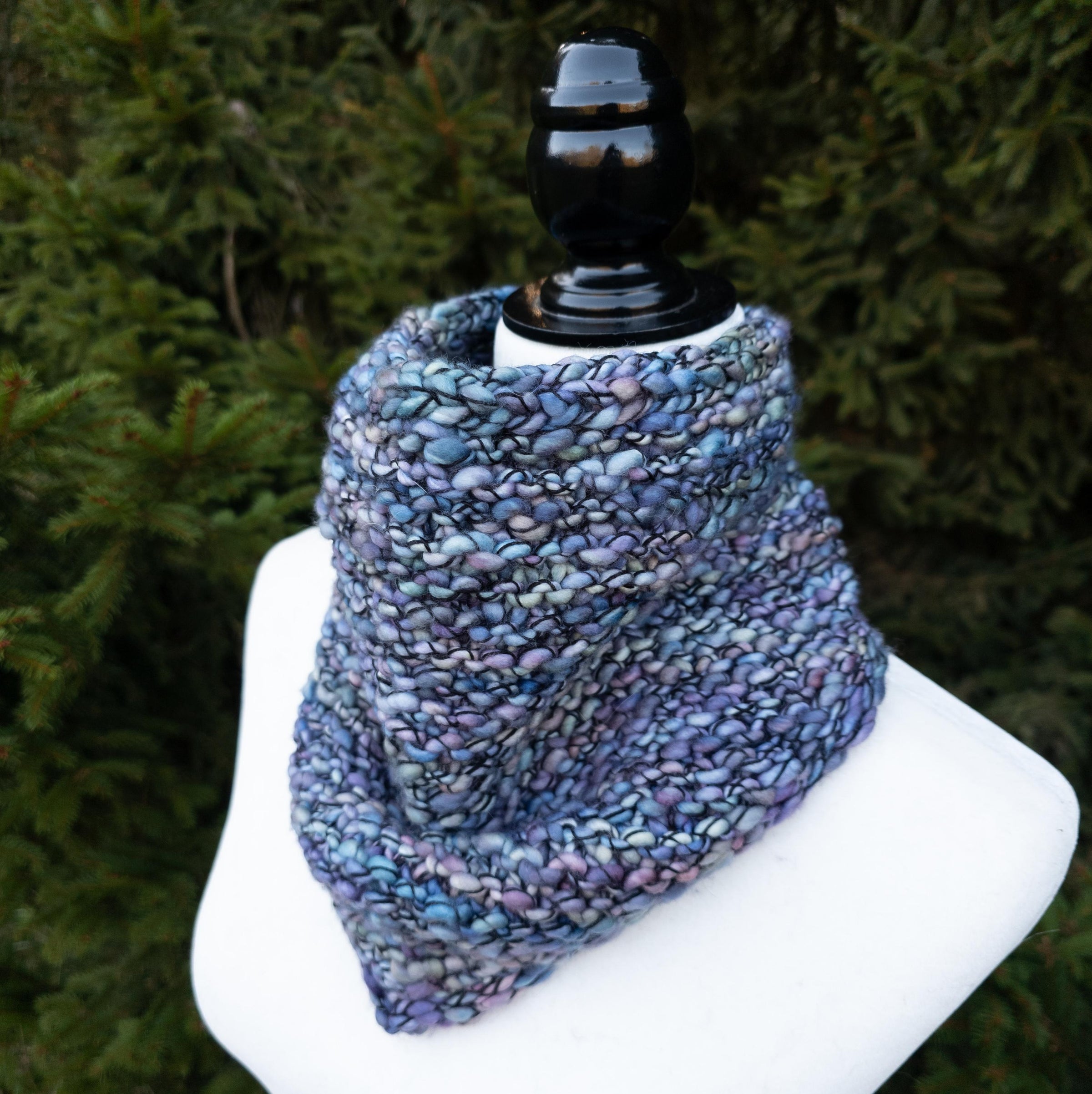 This super cozy, one-of-a-kind cowl/scarf is the perfect way to keep warm on cooler days. Hand-knit with a unique, luxurious ethically-sourced fine Merino wool from Malabrigo Yarn. This cowl is extremely soft and warm, with perfect drape and minimal bulk at the back of the neck.